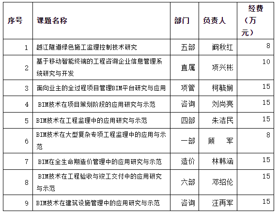 公司2012年科研創新資金資助項目評審與近期結束,由第一事業部、第四事業部、第五事業部、第六事業部、項目管理子公司、造價咨詢子公司、工程咨詢業務部和技術質量中心申報的9個課題獲得資助。